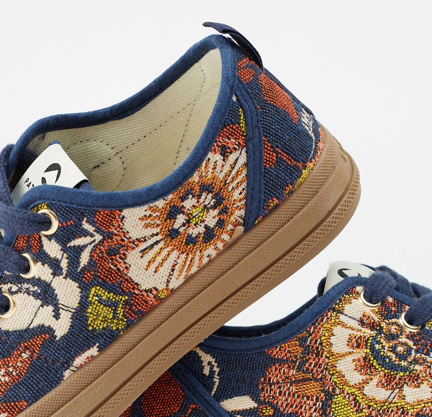 Revêtue d’imprimés floraux et végétaux, cette version de la ETCHE est une véritable ode à la nature. Les motifs, aux couleurs de l’automne, sont tissés dans un jacquard français, fabriqué sur des métiers traditionnels près de Lyon.